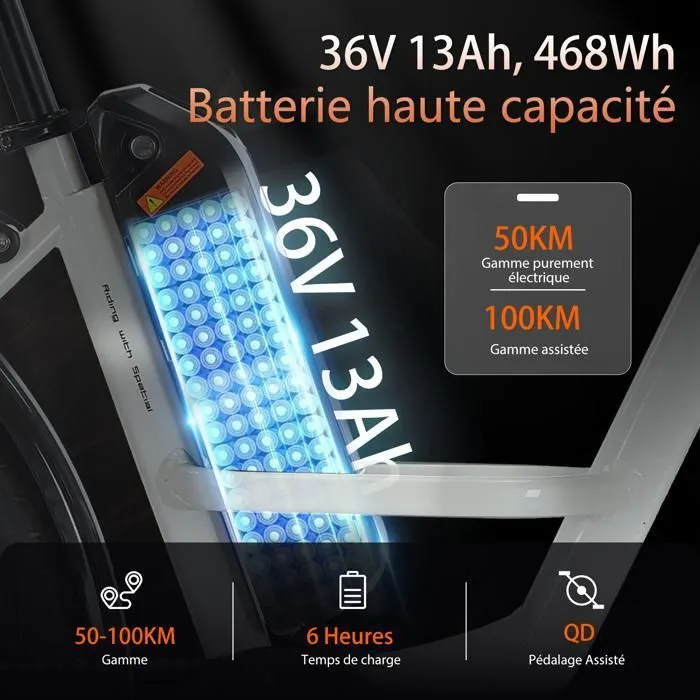 Dal punto di vista energetico, utilizza una batteria agli ioni di litio rimovibile da 36 V e 13 Ah che offre un’autonomia tipica di 50–100 km a seconda dell’utilizzo, della velocità e del rilievo. La bicicletta include anche fari anteriori luminosi, display LED multifunzione, sospensione anteriore e portapacchi, il che rende il modello pratico per gli spostamenti quotidiani, le gite più lunghe o le escursioni leggere. Può trasportare un carico fino a circa 120 kg ed è pensata per ciclisti di altezza compresa tra circa 155 cm e 190 cm.